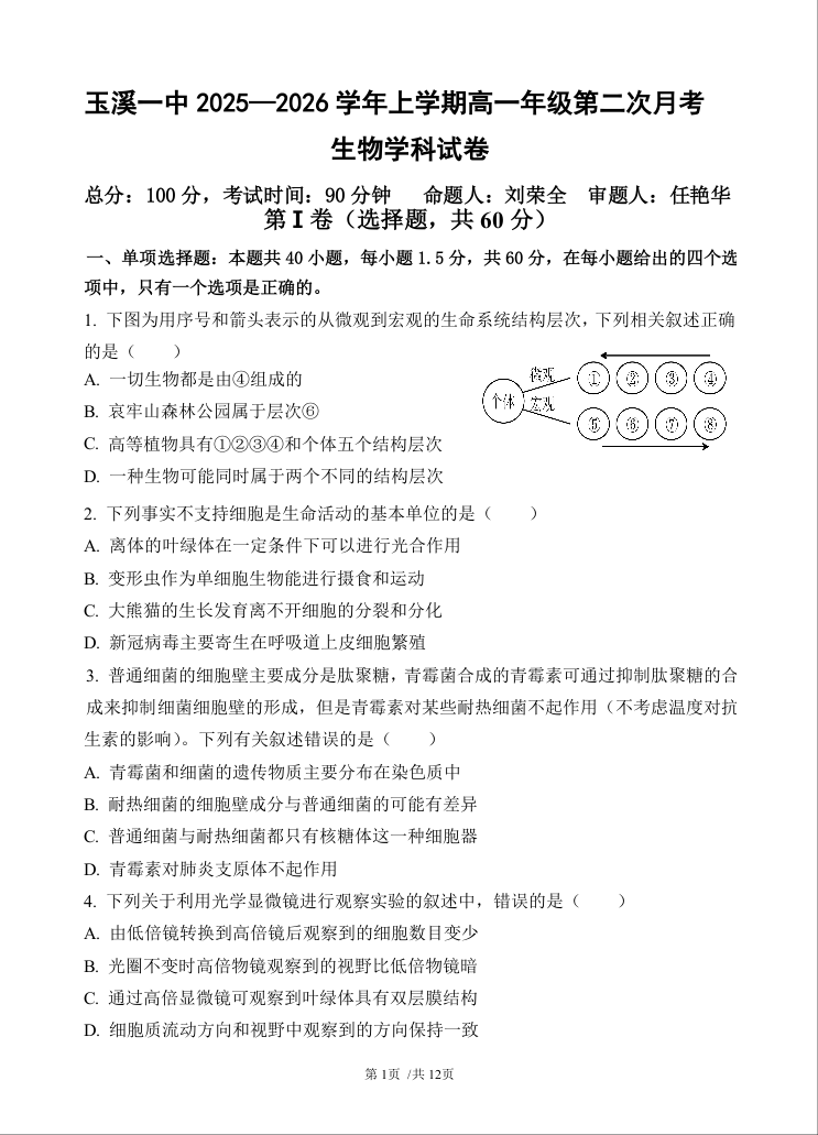 玉溪一中2025-2026学年高一上学期第二次月考 生物.doc