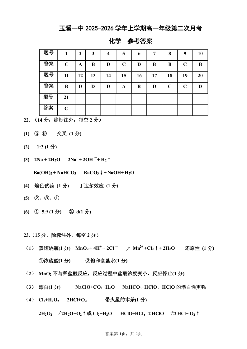 玉溪一中2025-2026学年高一上学期第二次月考 化学答案.docx