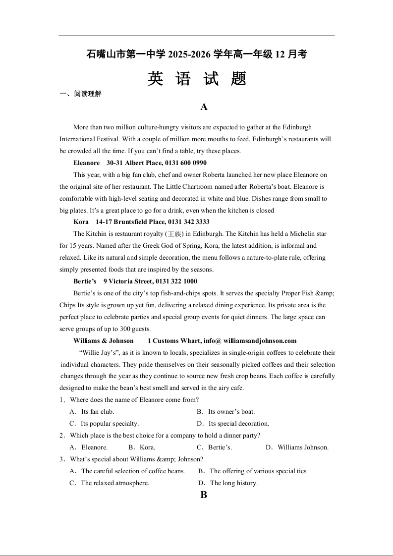 石嘴山市第一中学2025-2026学年高一年级12月月考 英语.docx