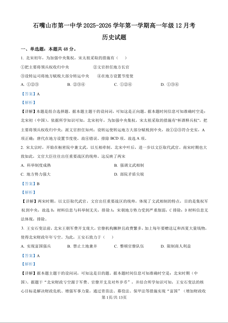 石嘴山市第一中学2025-2026学年高一年级12月月考 历史答案.docx