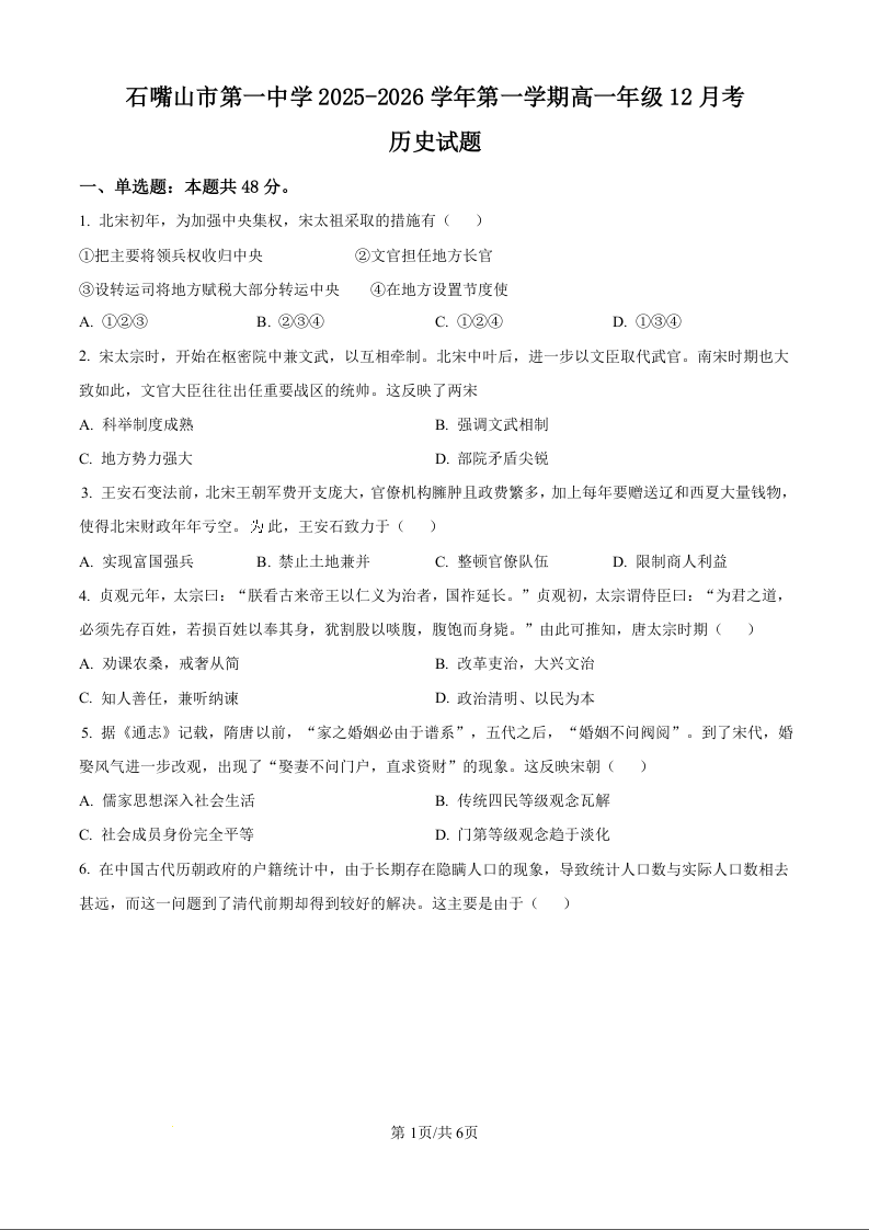 石嘴山市第一中学2025-2026学年高一年级12月月考 历史.docx