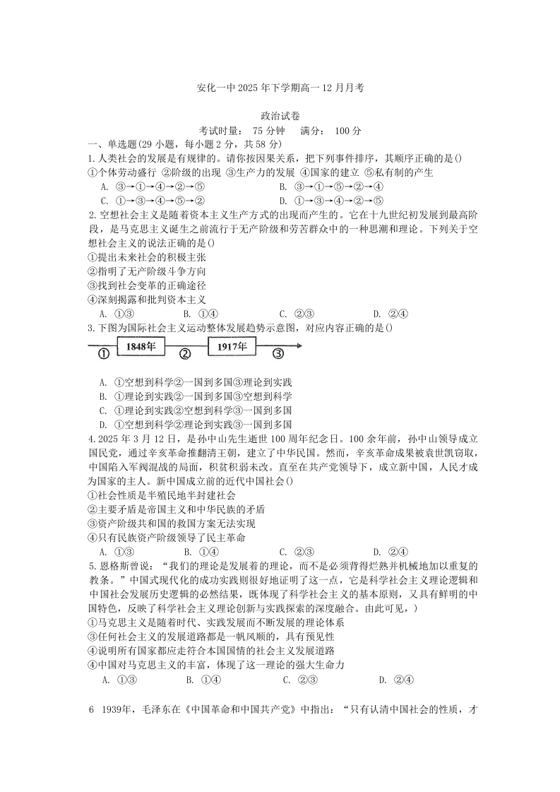 湖南省益阳市安化县第一中学2025-2026学年高一上学期12月月考 政治试题(含答案).docx