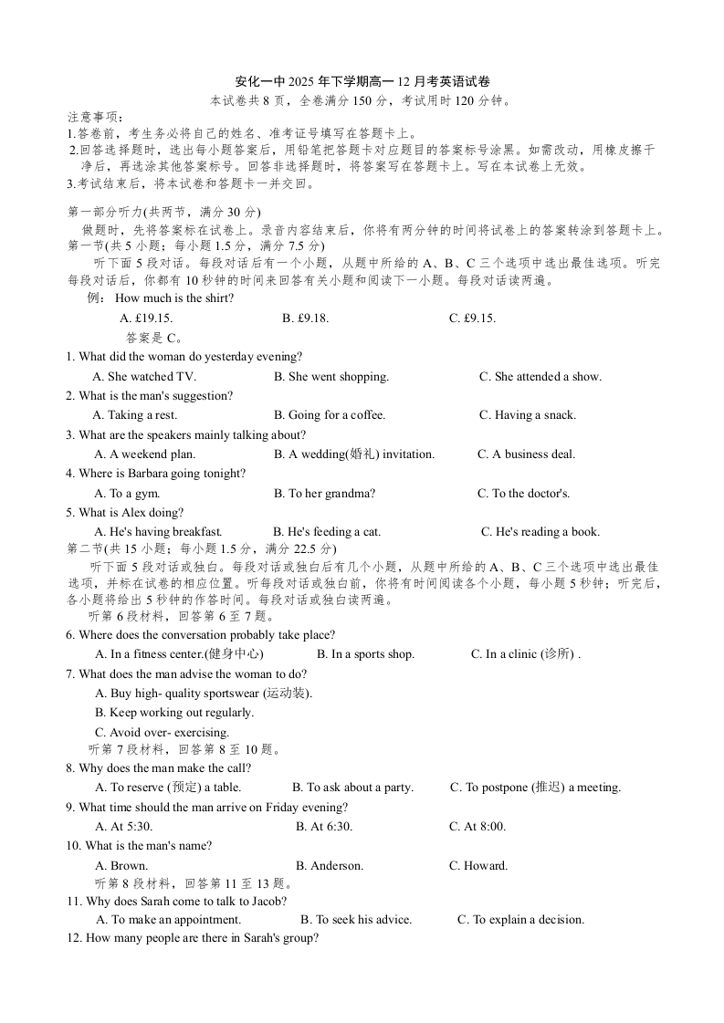 湖南省益阳市安化县第一中学2025-2026学年高一上学期12月月考 英语试题(含答案).docx