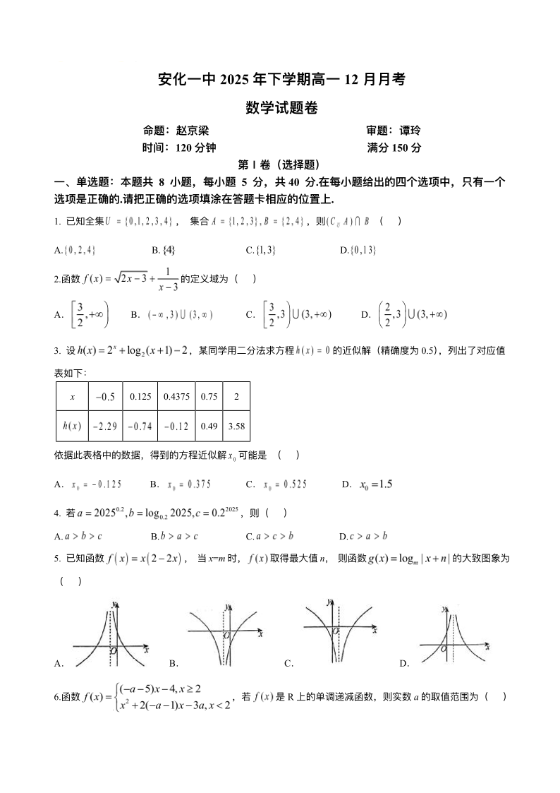 湖南省益阳市安化县第一中学2025-2026学年高一上学期12月月考 数学试题(含答案).pdf