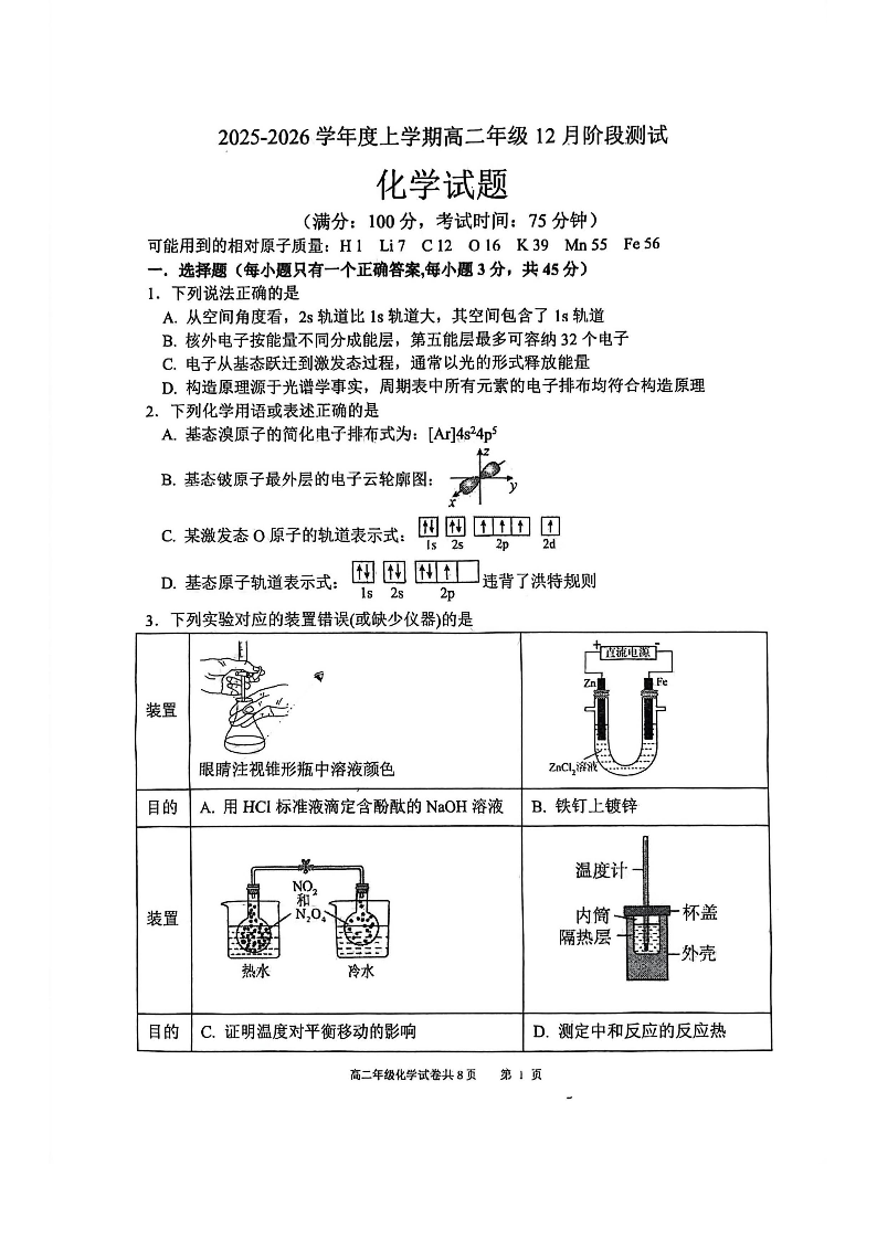辽宁省大连市第八中学2025-2026学年高二年级12月阶段测试 化学试题(含答案).pdf