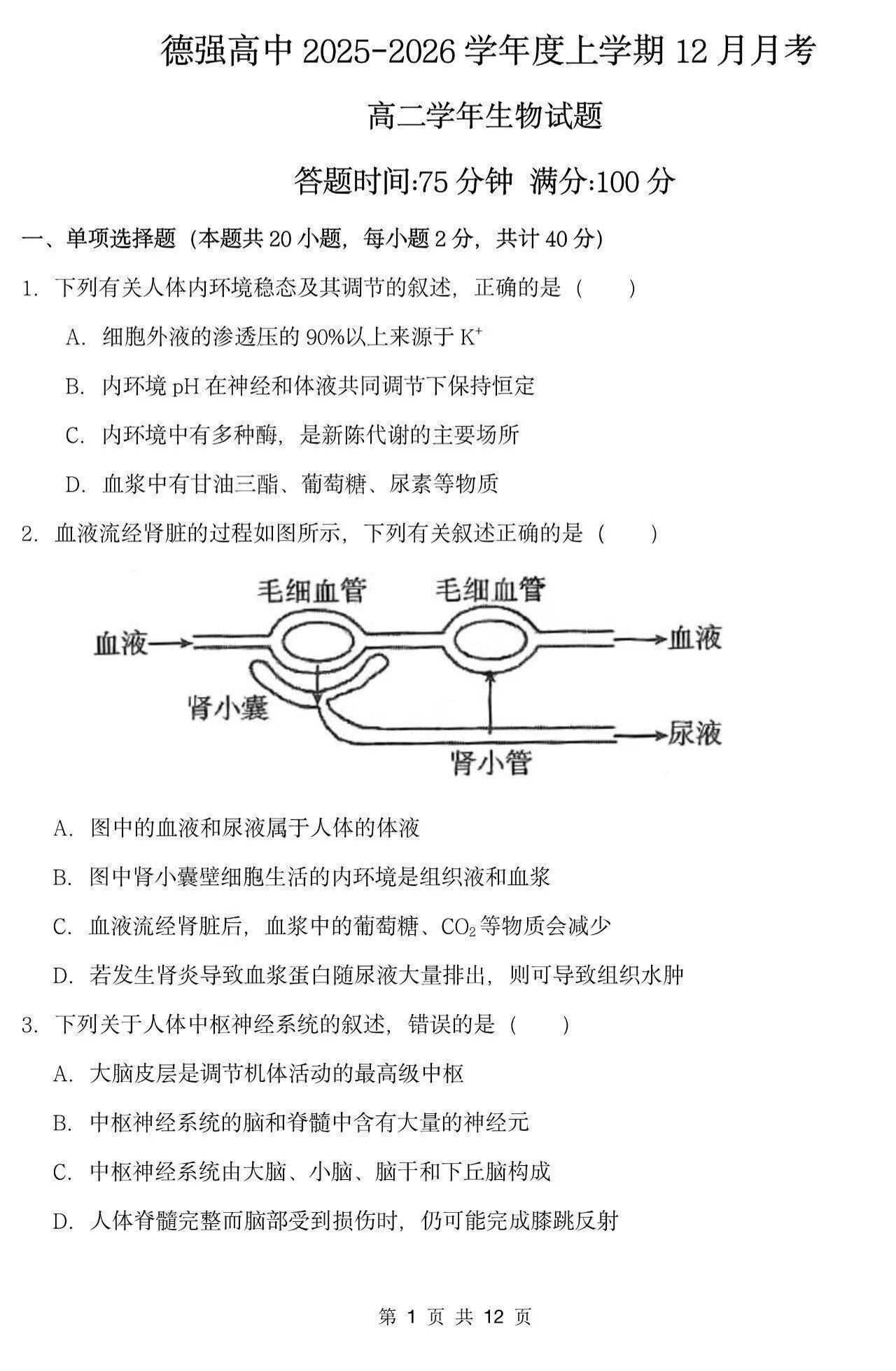 黑龙江省德强高中2025-2026学年高二上学期12月月考 生物试题(含答案).pdf