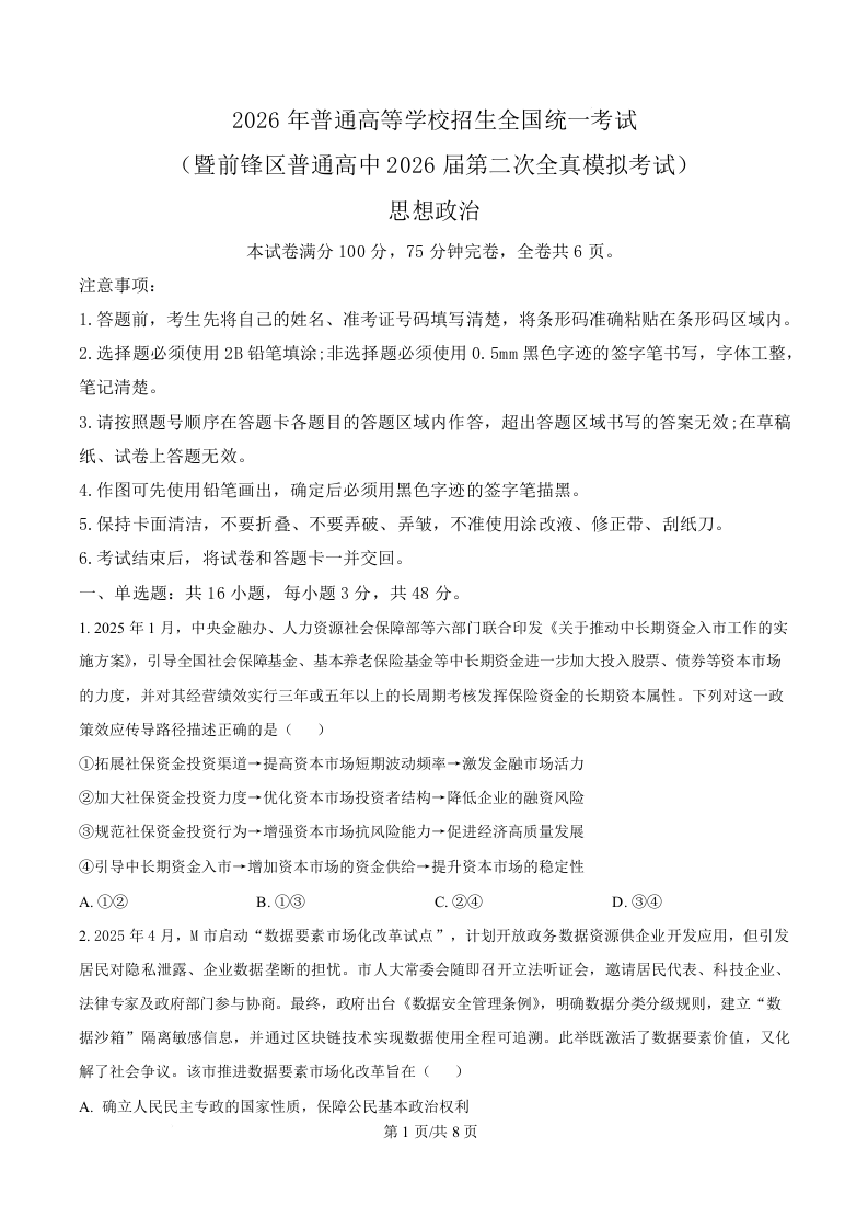 四川省广安市前锋区2026届高三上学期第二次全真模拟考试 政治.docx