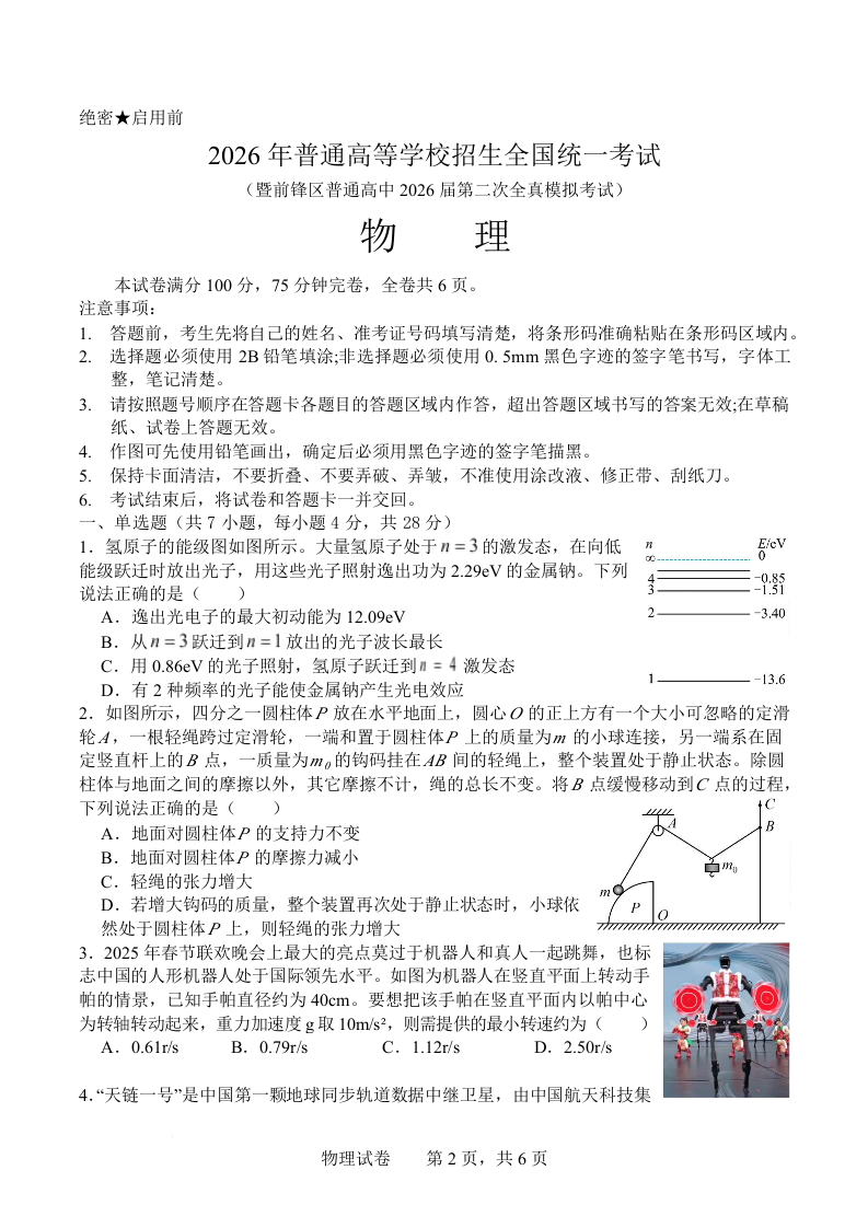 四川省广安市前锋区2026届高三上学期第二次全真模拟考试 物理试题(含答案).docx