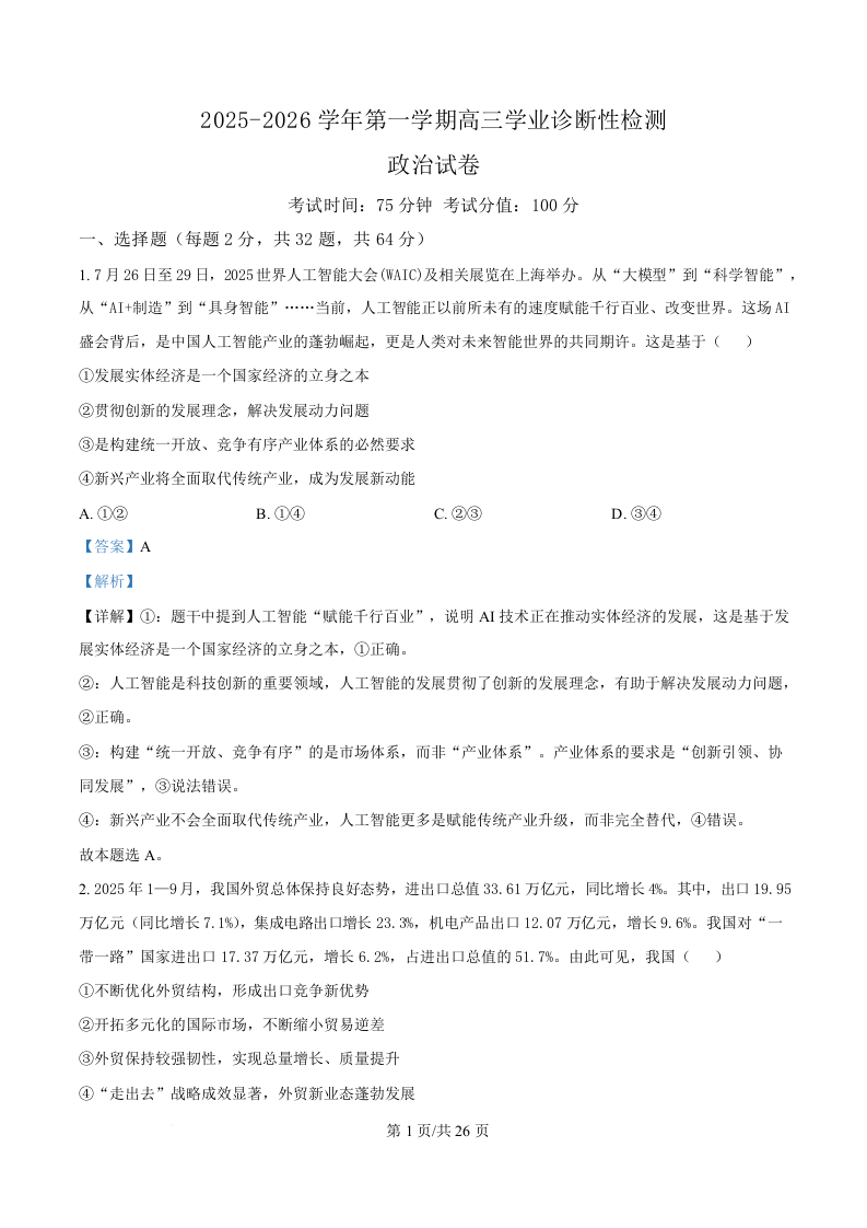 集宁一中2025-2026学年第一学期高三年级12月学业诊断检测 政治答案.docx