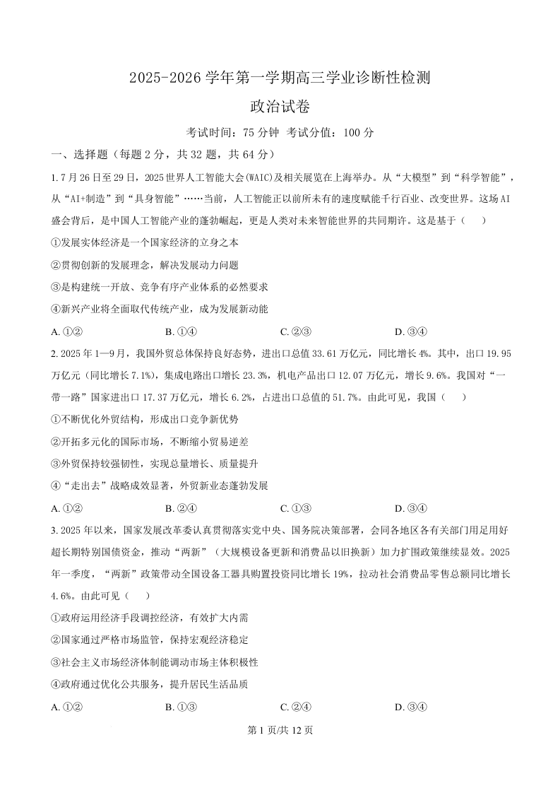 集宁一中2025-2026学年第一学期高三年级12月学业诊断检测 政治.docx