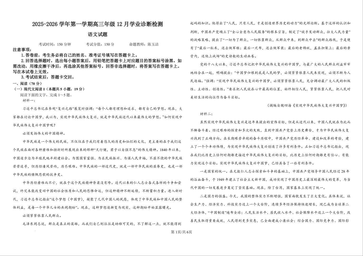 集宁一中2025-2026学年第一学期高三年级12月学业诊断检测 语文.docx