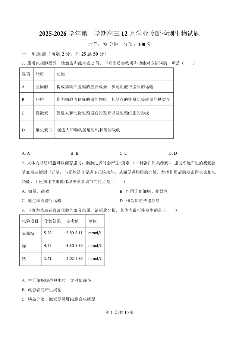 集宁一中2025-2026学年第一学期高三年级12月学业诊断检测 生物.docx