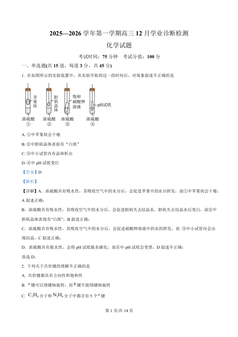集宁一中2025-2026学年第一学期高三年级12月学业诊断检测 化学答案.docx