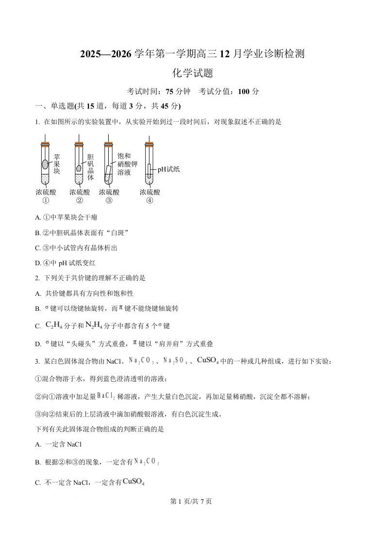 集宁一中2025-2026学年第一学期高三年级12月学业诊断检测 化学.docx