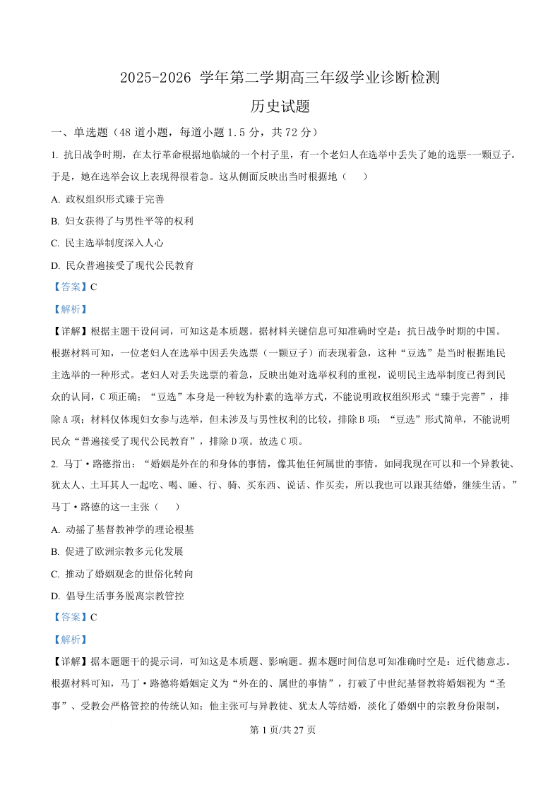 呼伦贝尔市海拉尔第二中学2025-2026学年第一学期高三年级12月诊断考试 历史答案.docx
