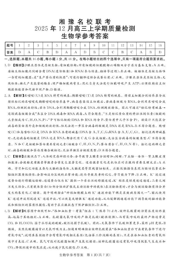 湘豫名校联考2025年12月高三上学期质量检测 生物答案.pdf