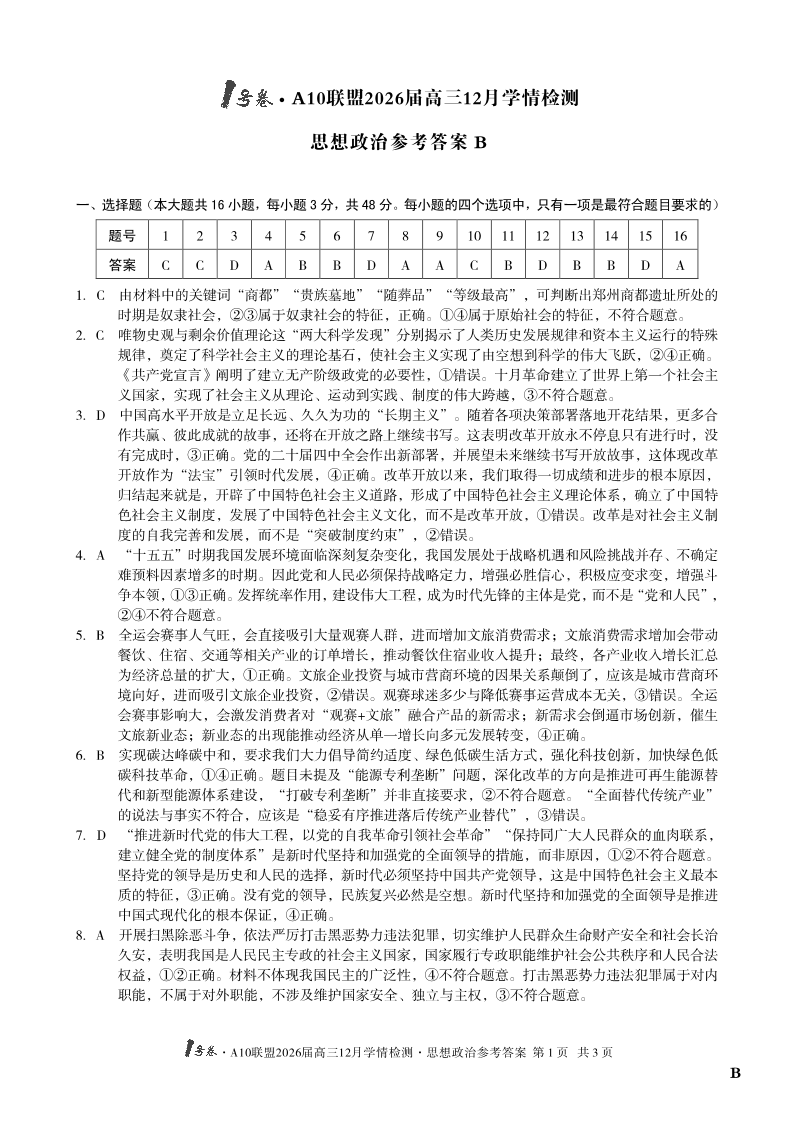 1号卷·A10联盟2026届高三12月学情检测 政治B答案.pdf