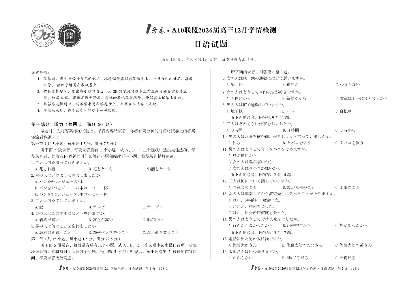 1号卷·A10联盟2026届高三12月学情检测 日语.pdf