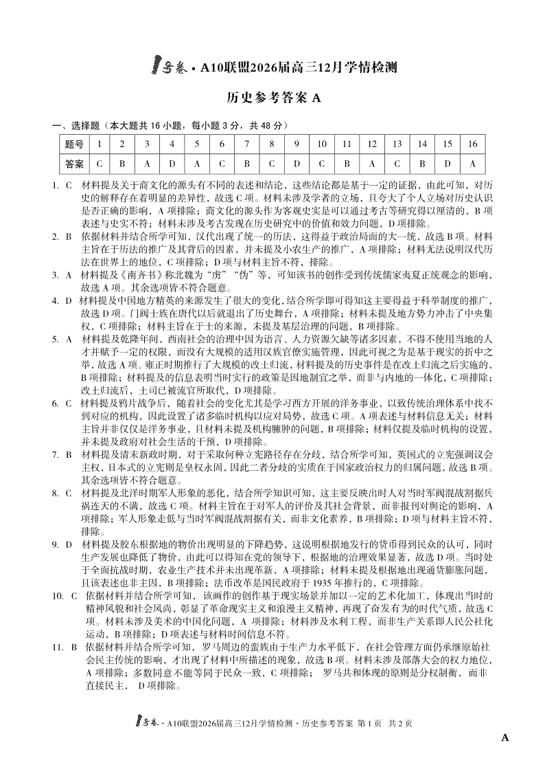 1号卷·A10联盟2026届高三12月学情检测 历史A答案.pdf