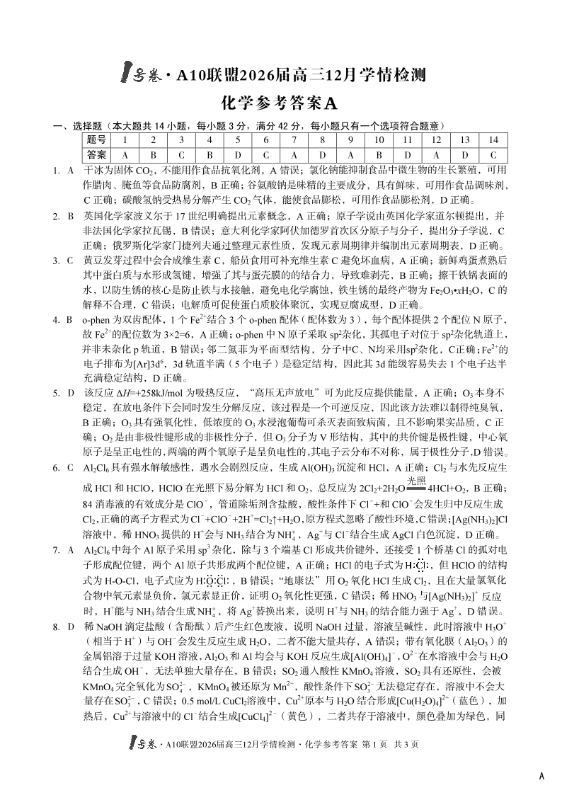 1号卷·A10联盟2026届高三12月学情检测 化学A答案.pdf