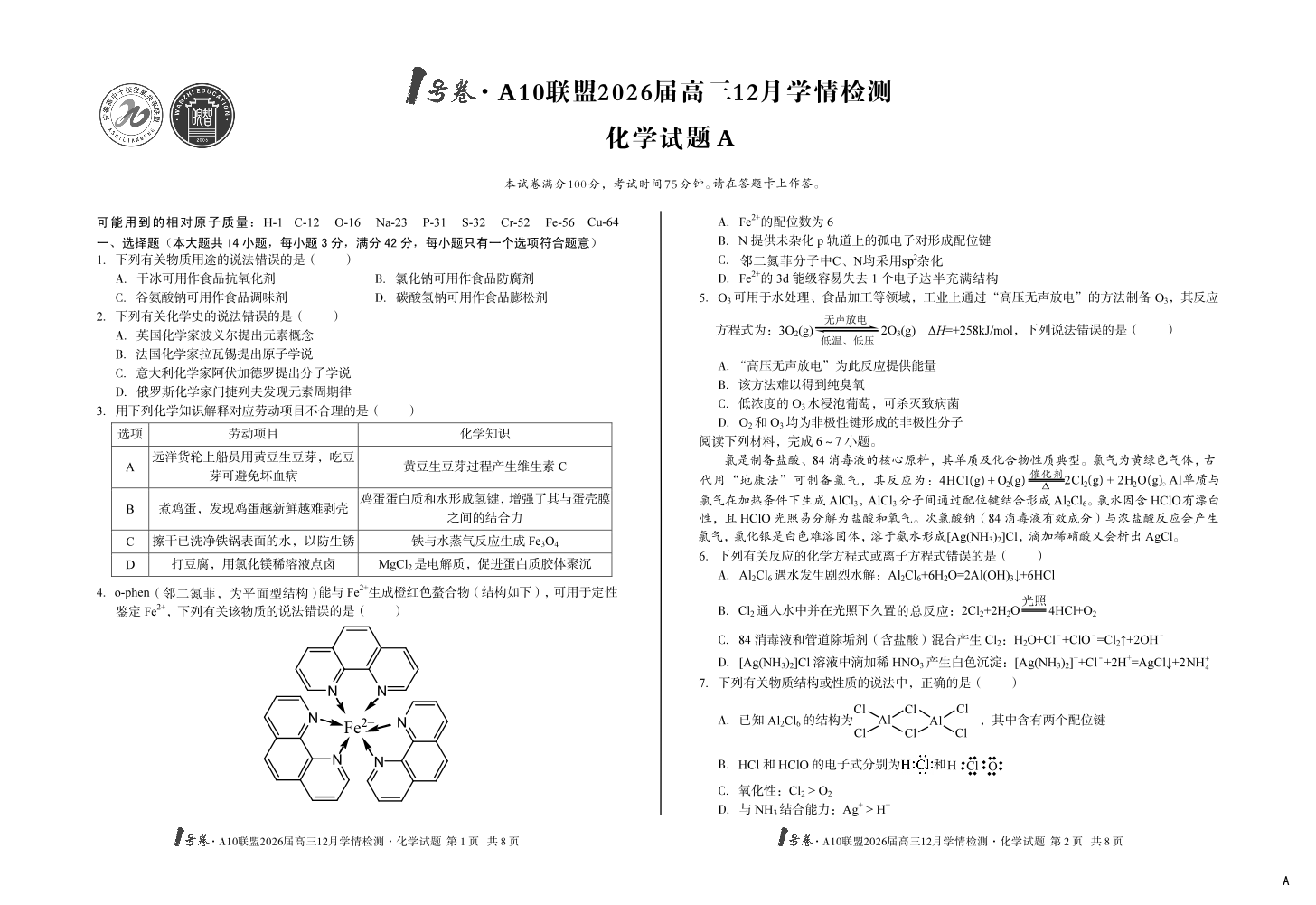 1号卷·A10联盟2026届高三12月学情检测 化学A.pdf