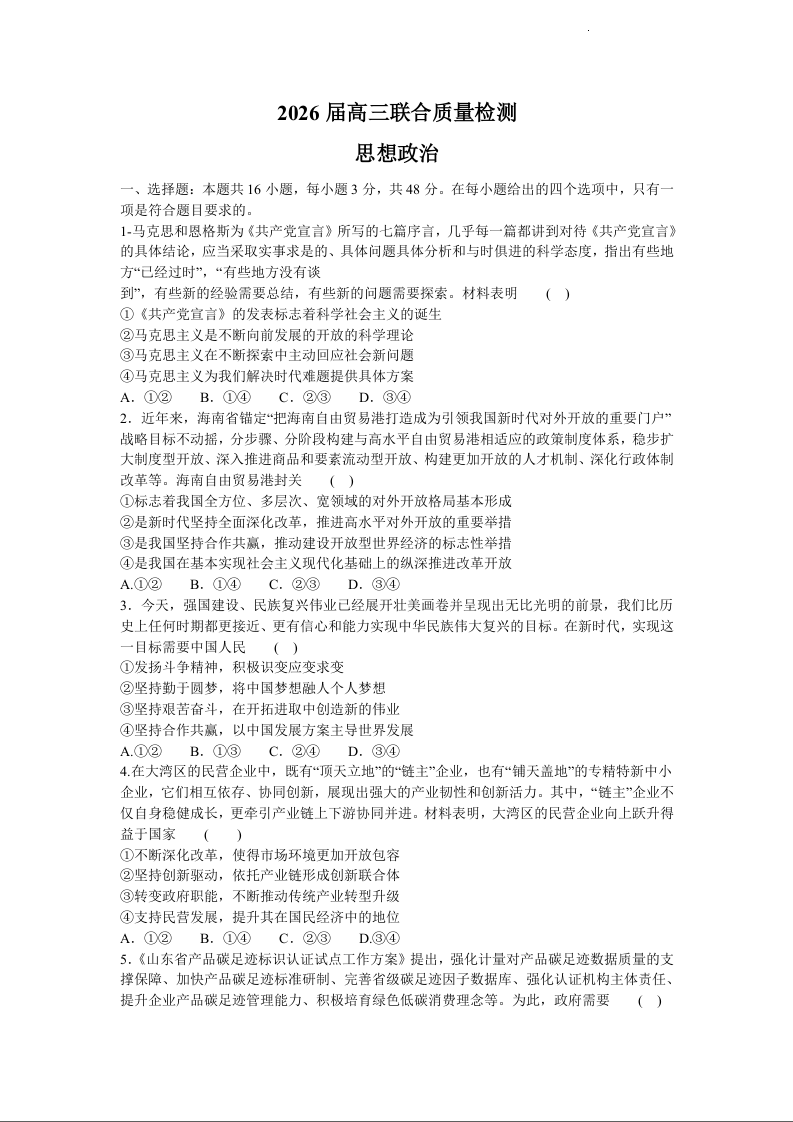 陕西省·天舟高考2026届高三12月联合质量检测 政治.docx