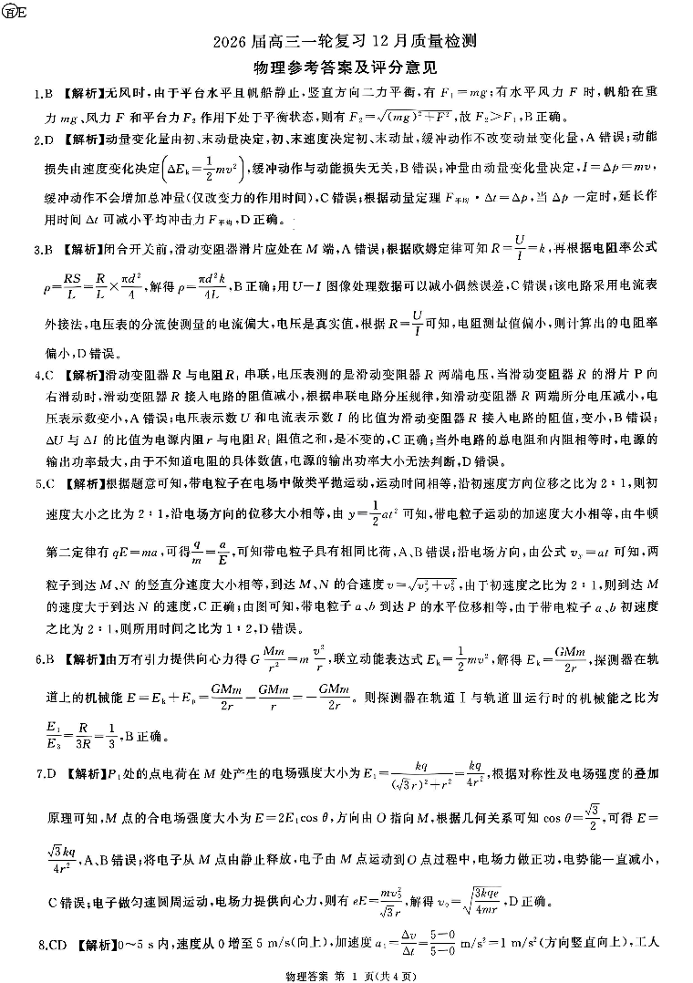 百师联盟2026届高三一轮复习12月质量检测 物理答案.pdf