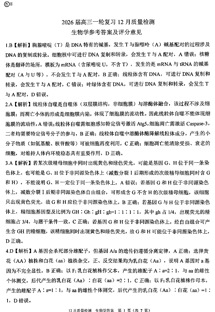 百师联盟2026届高三一轮复习12月质量检测 生物答案.pdf