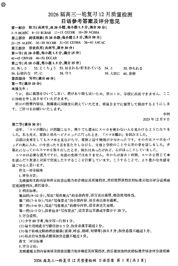 百师联盟2026届高三一轮复习12月质量检测 日语答案.pdf