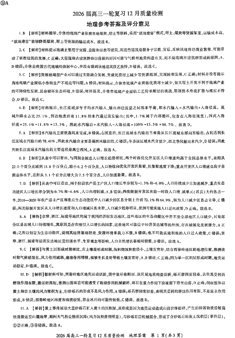 百师联盟2026届高三一轮复习12月质量检测 地理答案.pdf