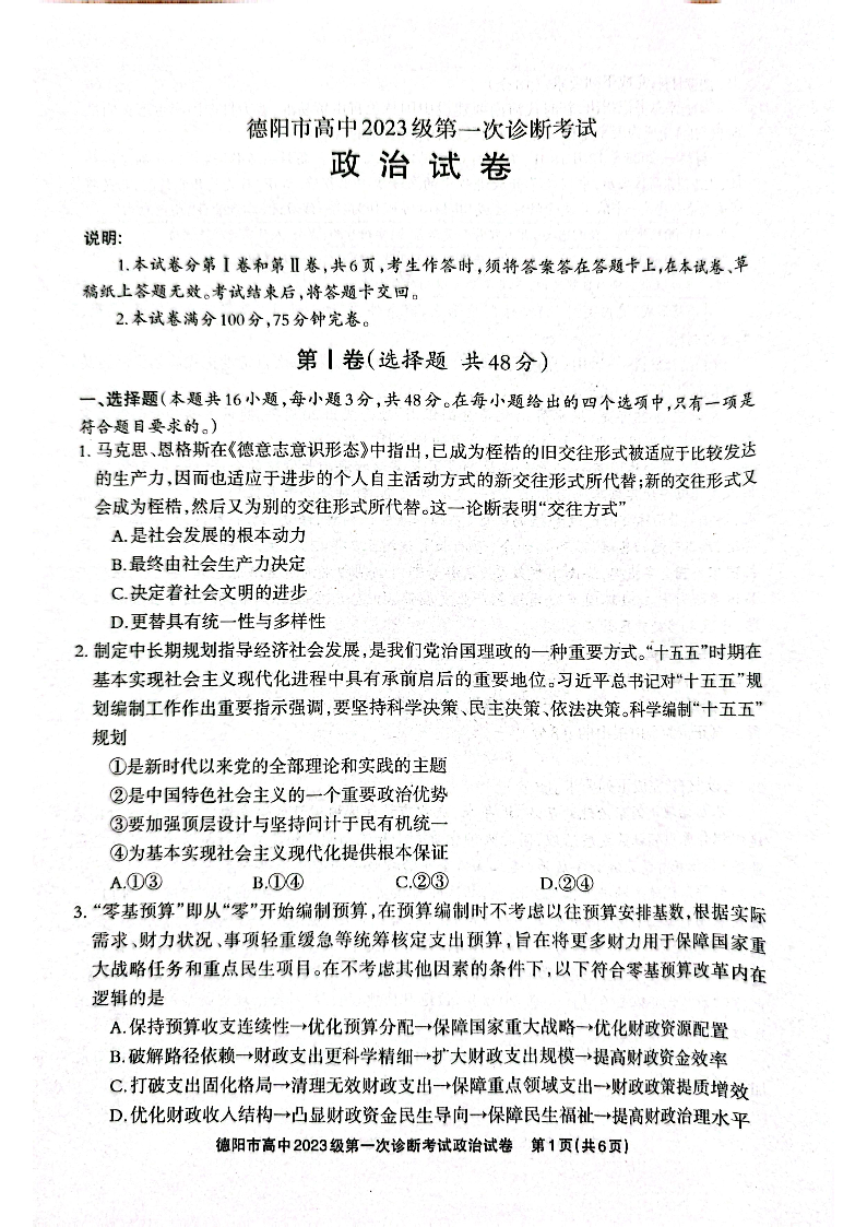 德阳市高中2023级第一次诊断考试 政治.pdf