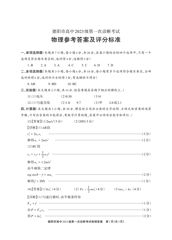 德阳市高中2023级第一次诊断考试 物理答案.pdf
