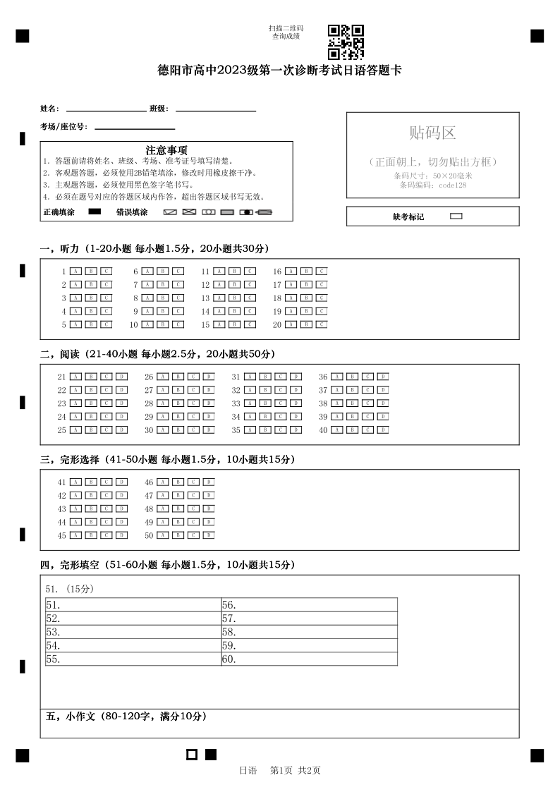 德阳市高中2023级第一次诊断考试 日语答题卡.pdf
