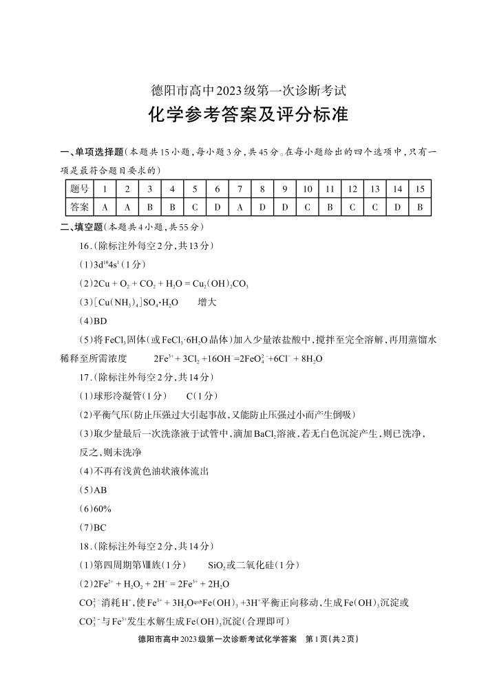 德阳市高中2023级第一次诊断考试 化学答案.pdf