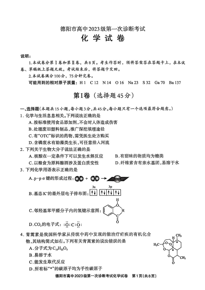 德阳市高中2023级第一次诊断考试 化学.pdf