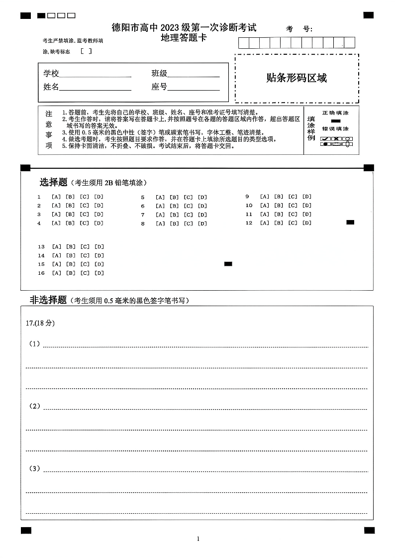 德阳市高中2023级第一次诊断考试 地理答题卡.pdf