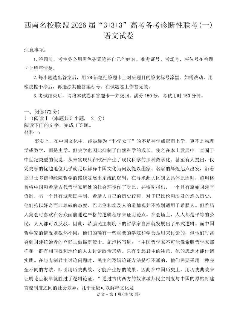 西南名校联盟2026届“3+3+3”高考备考诊断性联考(一)语文.docx