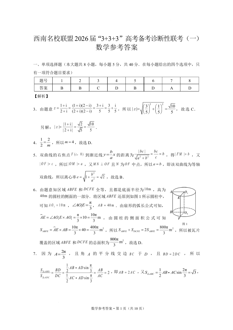西南名校联盟2026届“3+3+3”高考备考诊断性联考(一)数学答案.docx