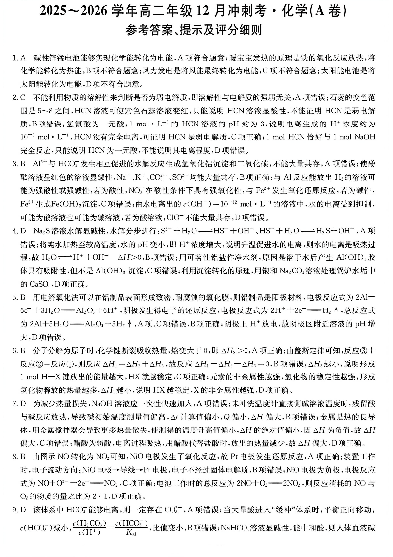 化学答案-25-26学年山西高二12月卓越联盟联考.pdf