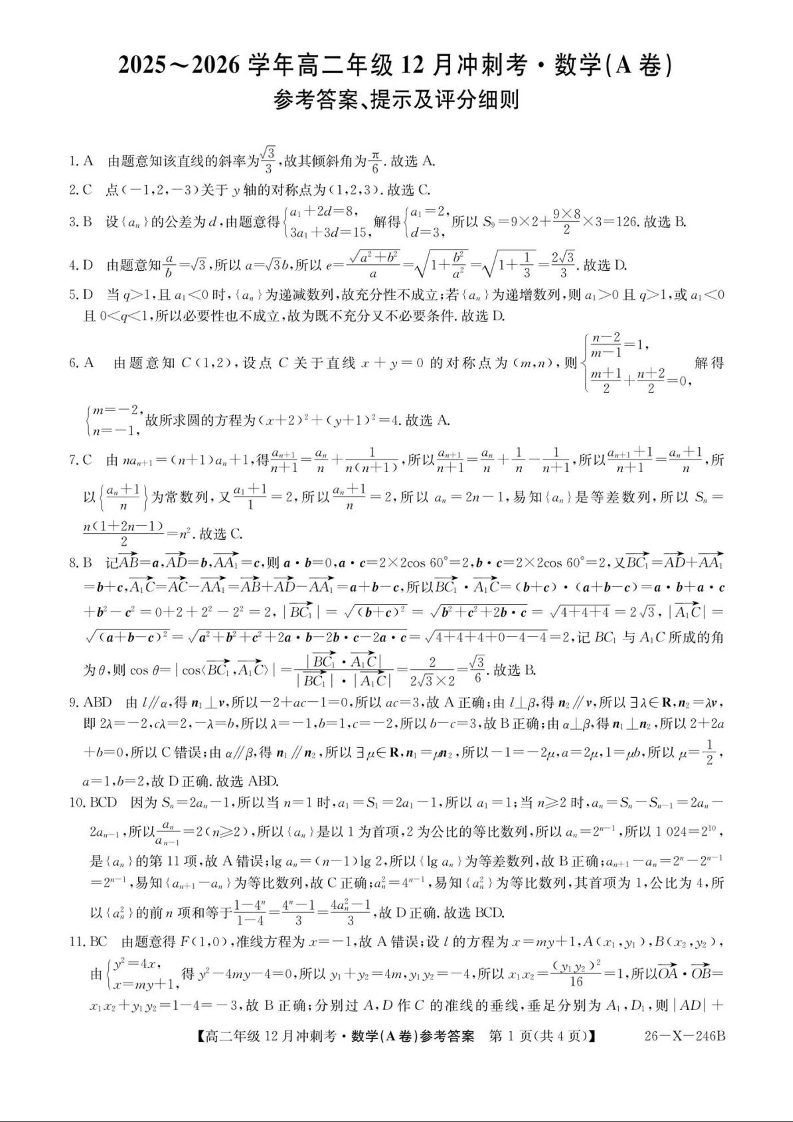 数学答案-25-26学年山西高二12月卓越联盟联考.docx