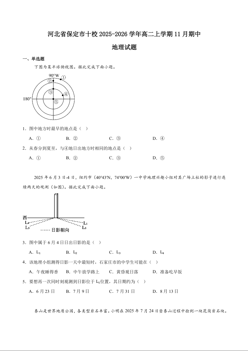 河北省保定市十校2025-2026学年高二上学期金太阳期中考试 地理试题(含答案).docx