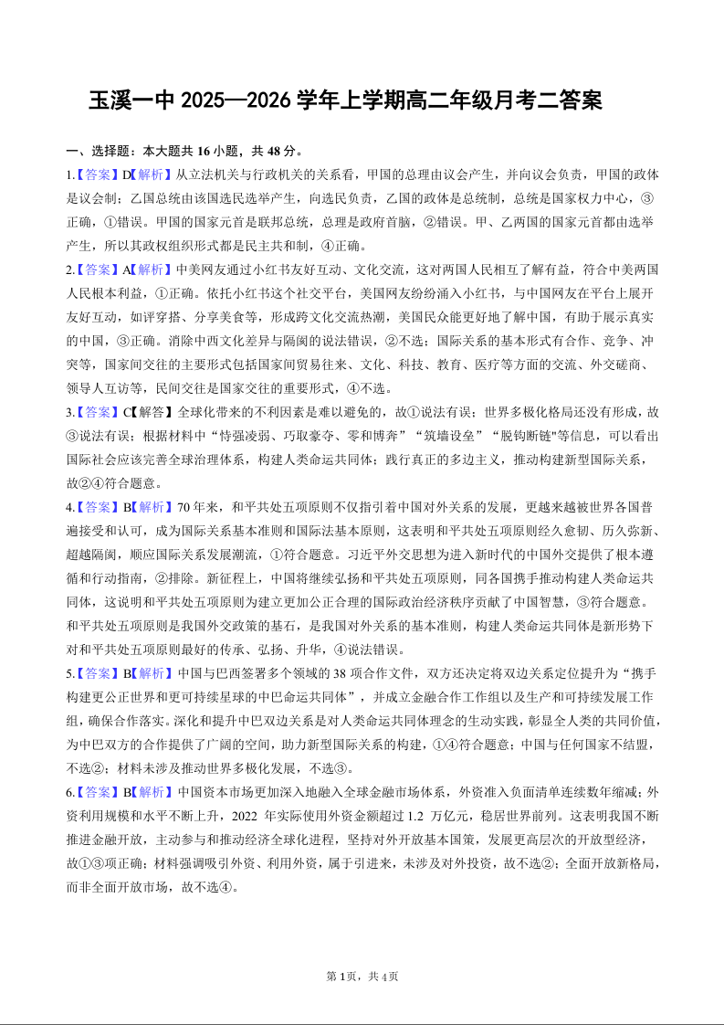 玉溪一中2025-2026学年高二年级上学期第二次月考 政治答案.docx