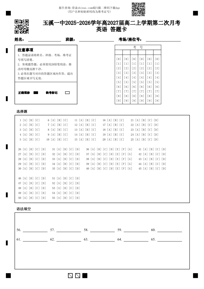 玉溪一中2025-2026学年高二年级上学期第二次月考 英语答题卡.pdf
