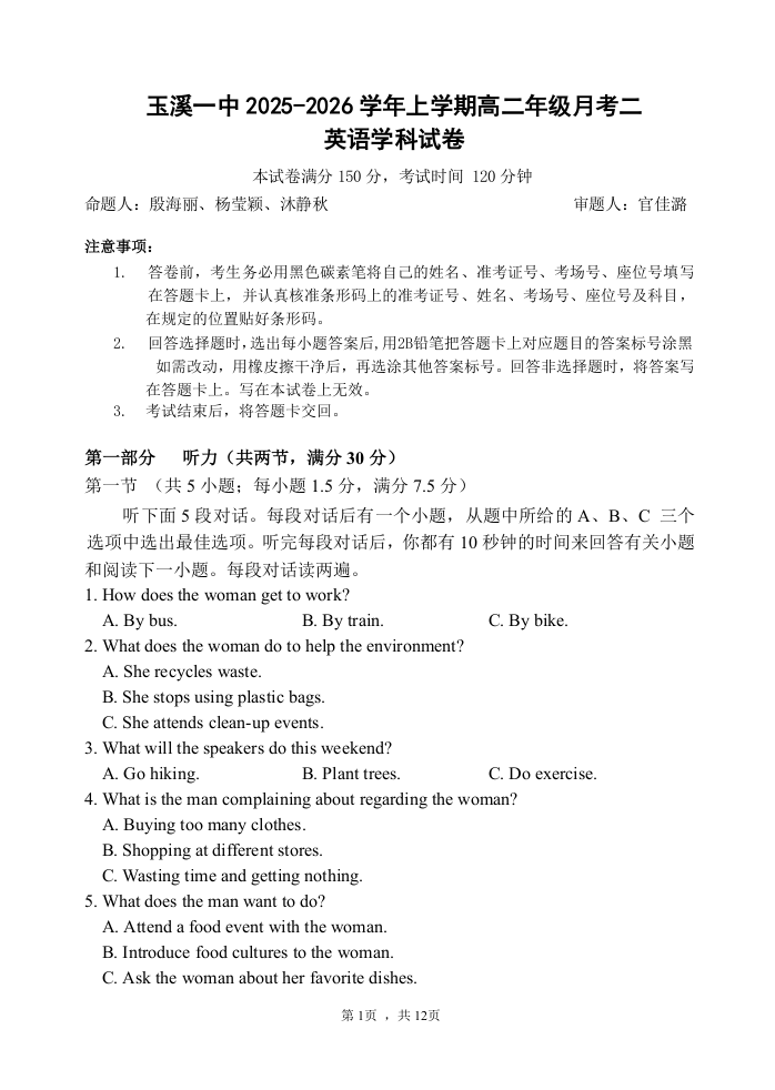 玉溪一中2025-2026学年高二年级上学期第二次月考 英语.docx