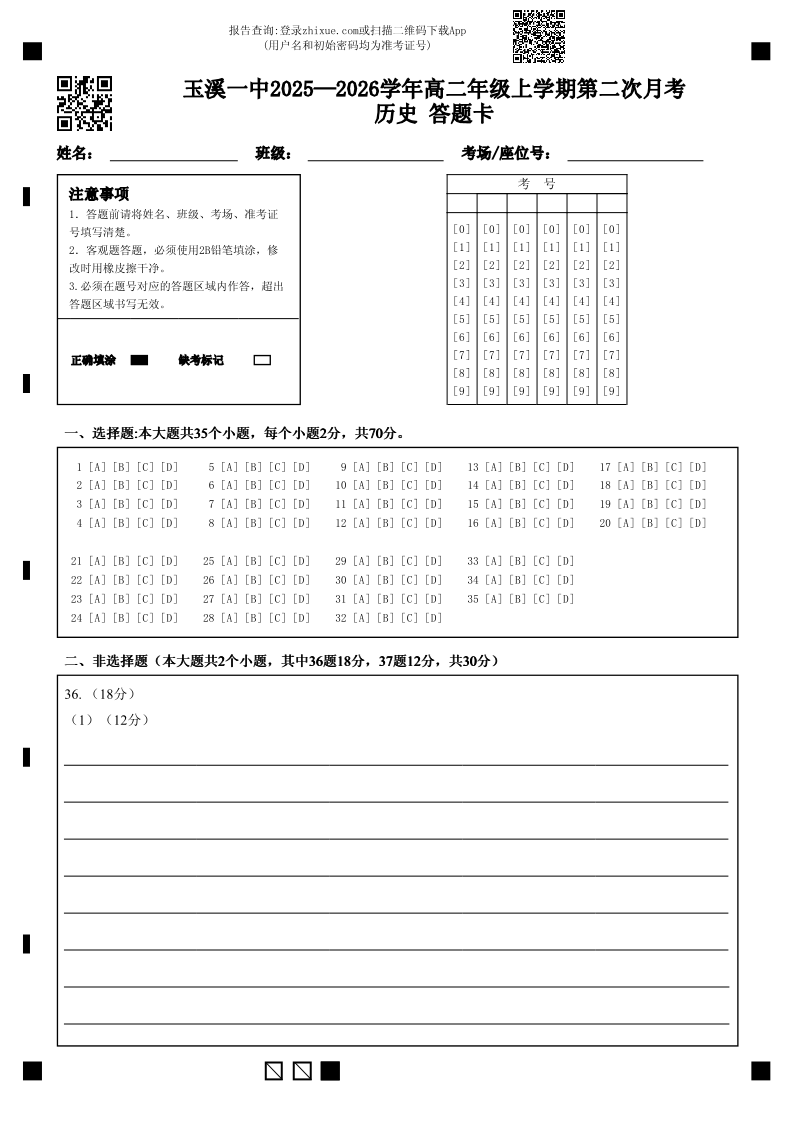 玉溪一中2025-2026学年高二年级上学期第二次月考 历史答题卡.pdf