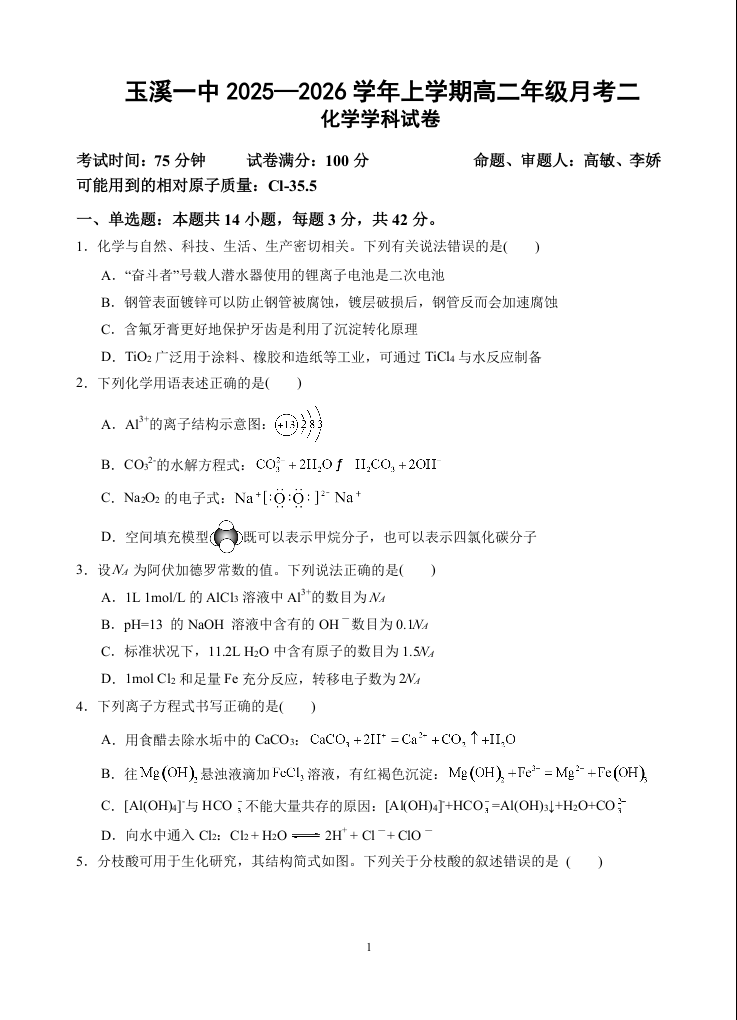 玉溪一中2025-2026学年高二年级上学期第二次月考 化学.doc