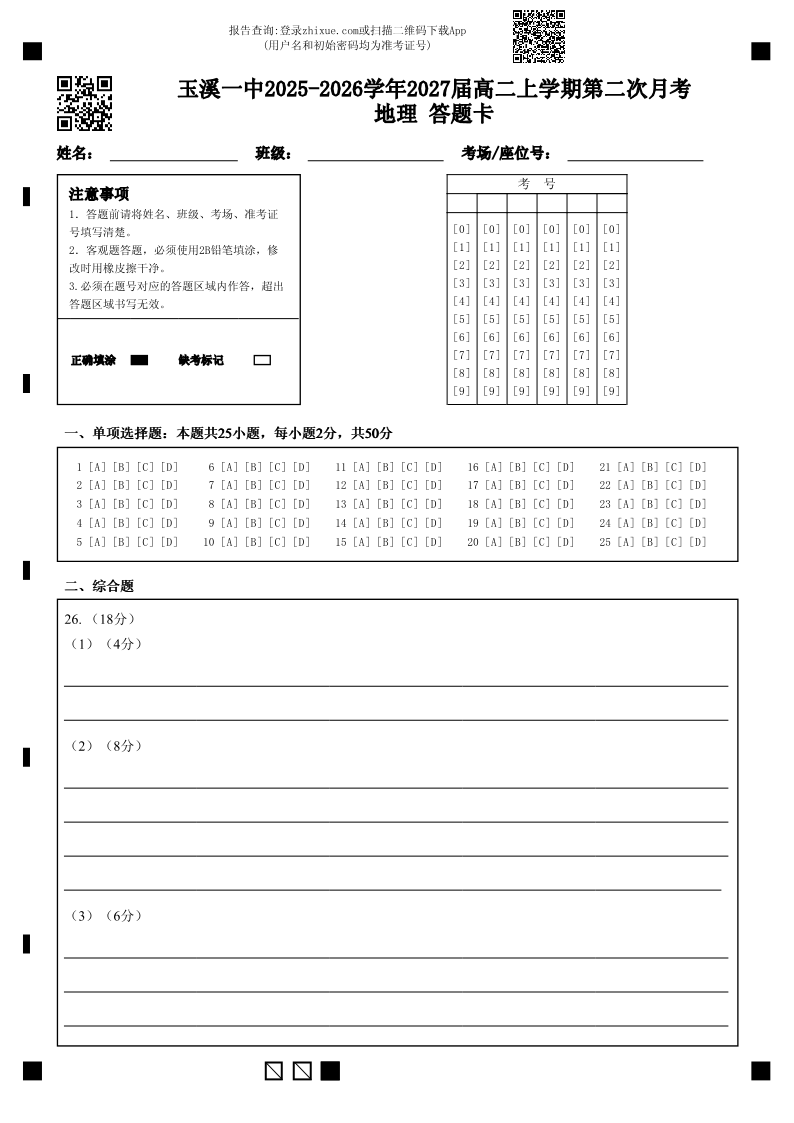 玉溪一中2025-2026学年高二年级上学期第二次月考 地理答题卡.pdf