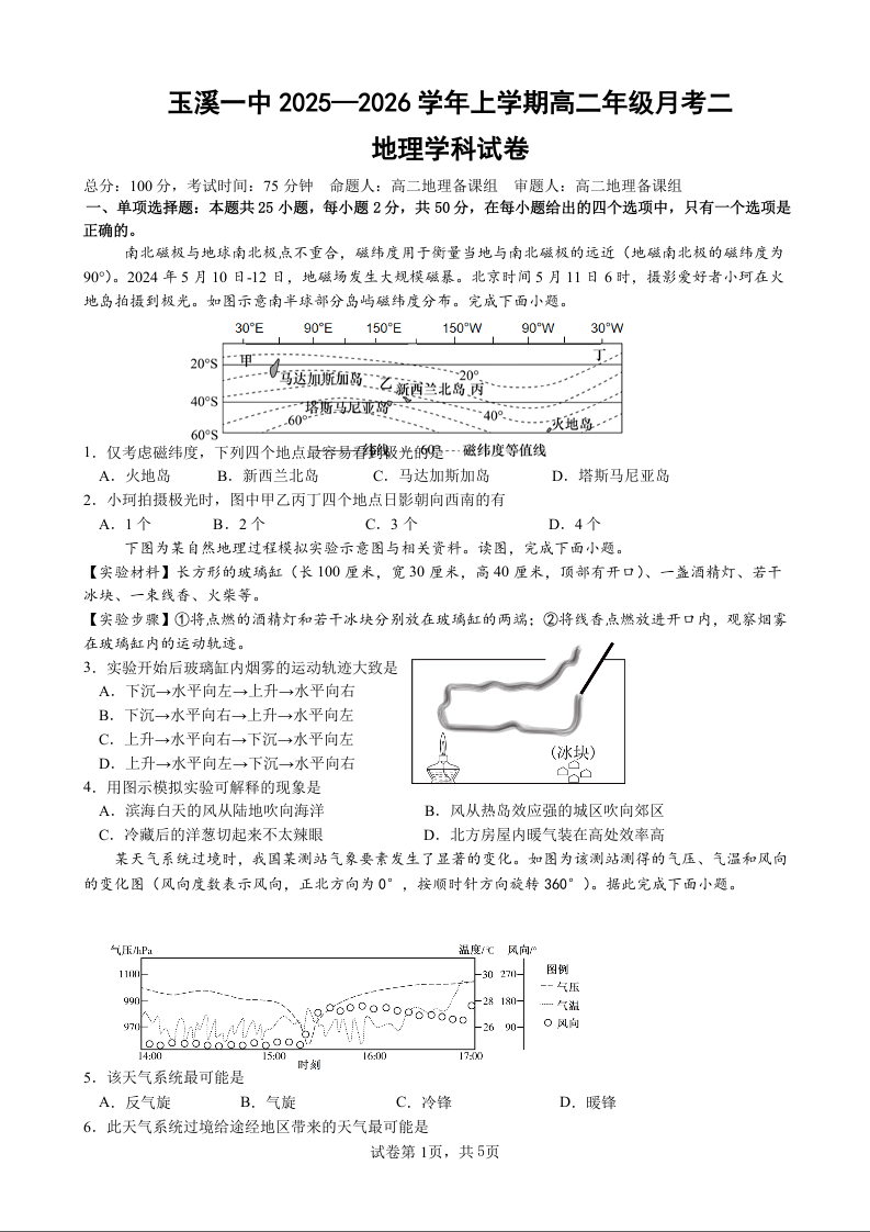 玉溪一中2025-2026学年高二年级上学期第二次月考 地理.docx