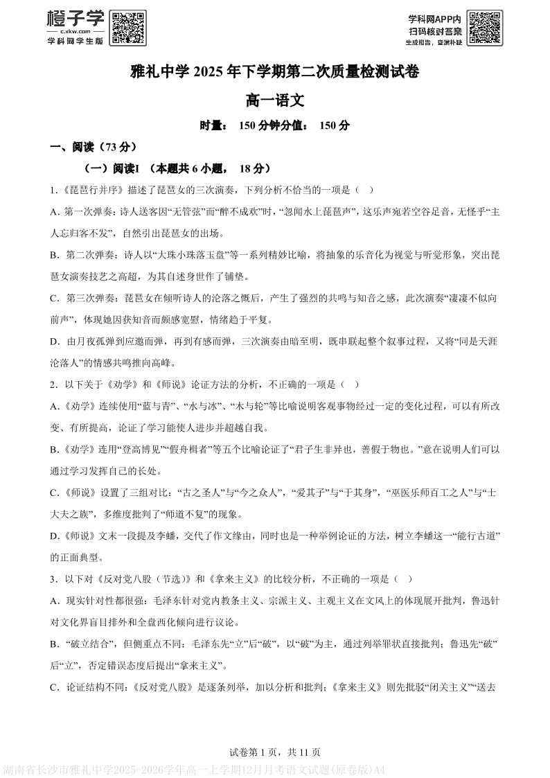 雅礼中学2025-2026学年高一上学期第二次质量检测 语文.pdf