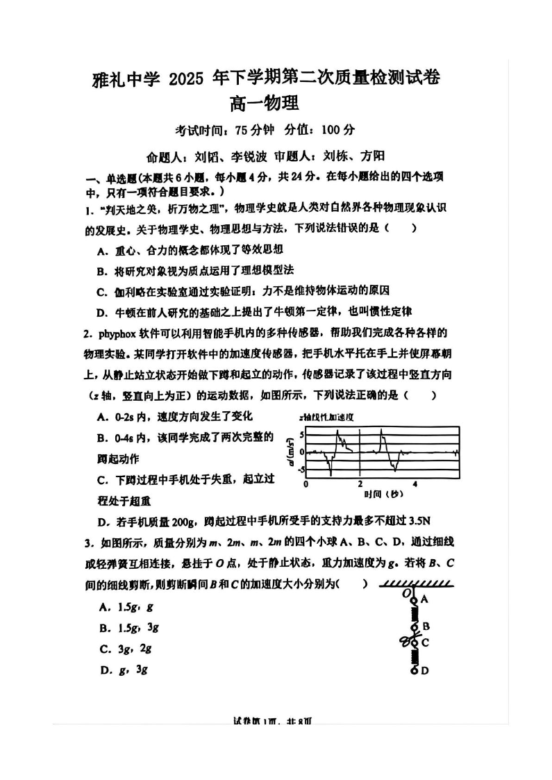 雅礼中学2025-2026学年高一上学期第二次质量检测 物理.pdf